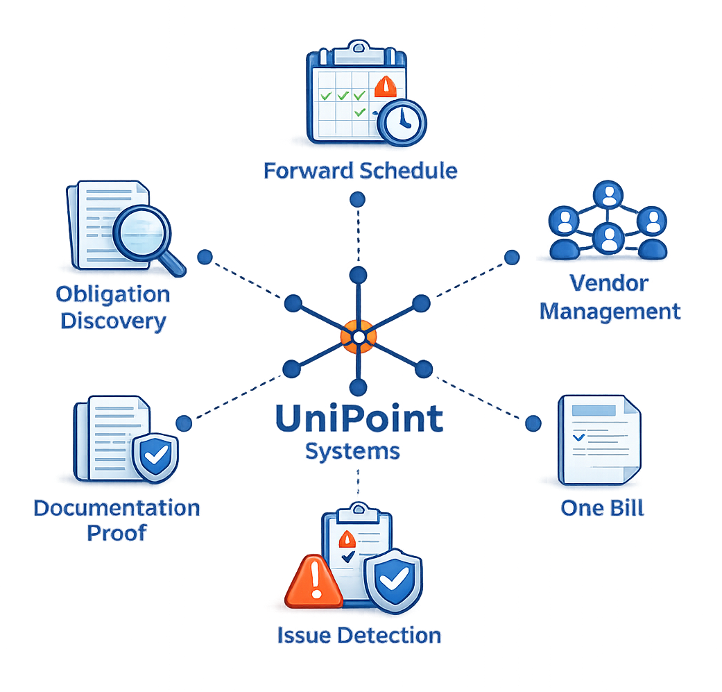 UniPoint operates external compliance obligations, including inspections, compliance scheduling, vendor coordination, and proof custody under one accountable system and one bill.